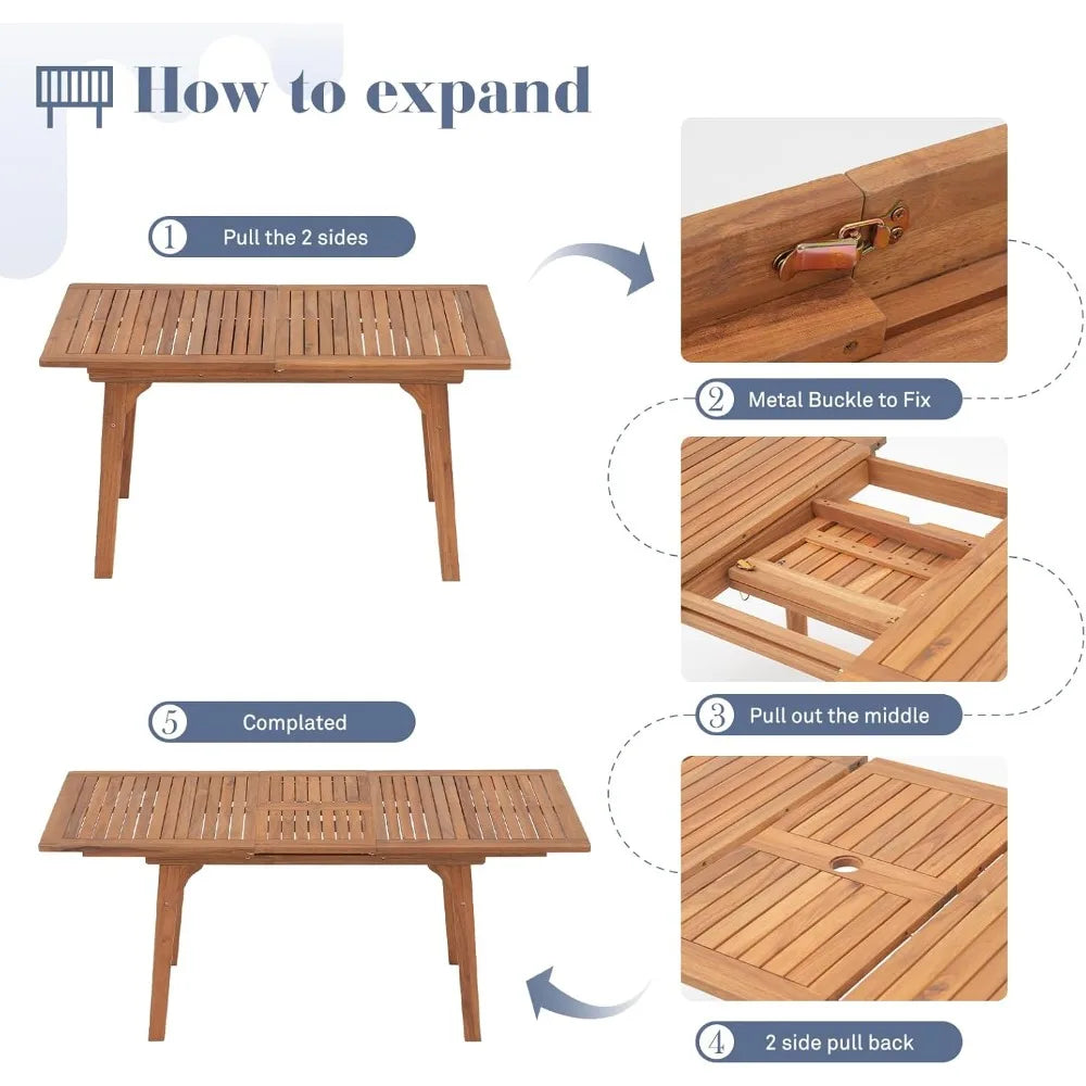 Acacia Wood Patio Dining Set for 6-8, Outdoor Expandable Table and Chairs Set. ***Umbrella and Base Not Included***