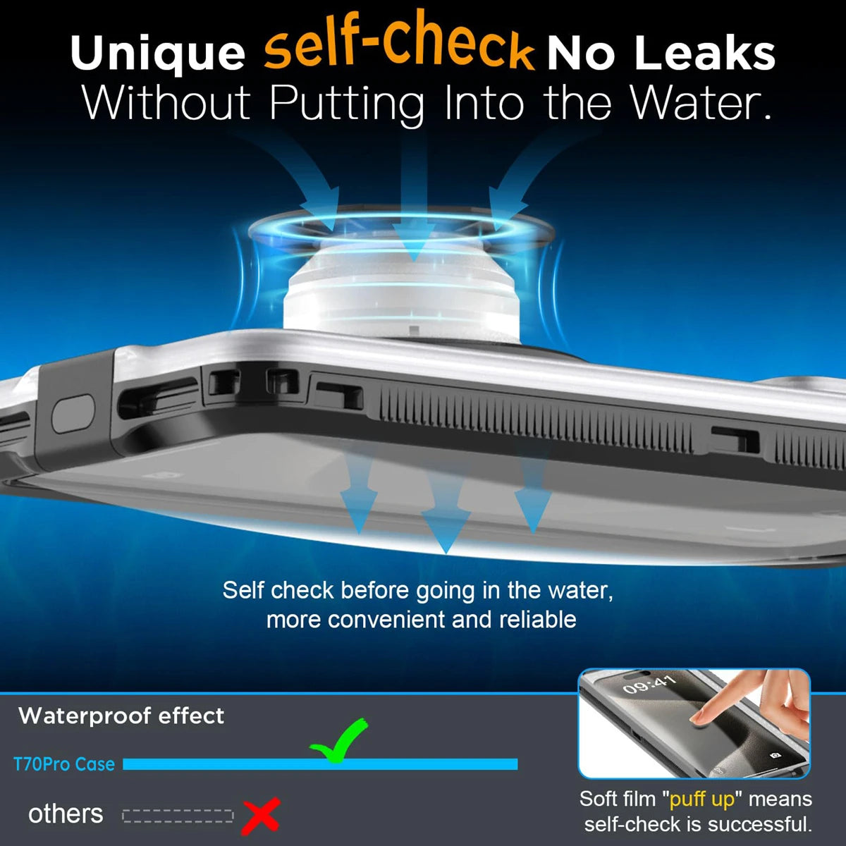 With Self-Check Waterproof Function: Our waterproof case has a Self-Check waterproof function during use. According to the usage steps, if the bulges on the screen soft film do not dissipate when you tap it lightly with your finger, it proves that it's fully sealed and waterproof. Other waterproof cases cannot confirm whether they are already waterproof, which may lead to unexpected situations during use.