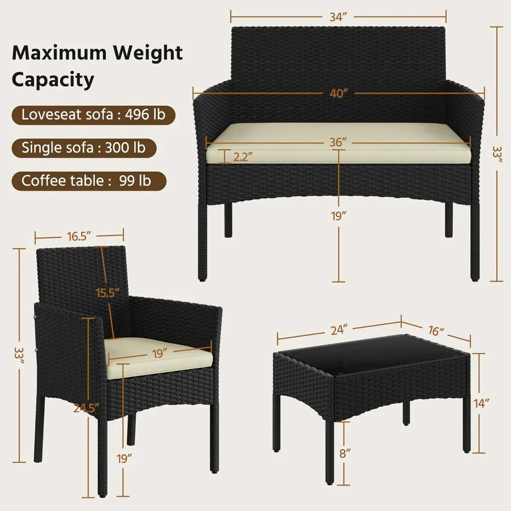 Patio Furniture Set 4 Pieces, Rattan Wicker Chair and Loveseat with Soft Cushions and Glass Table Top