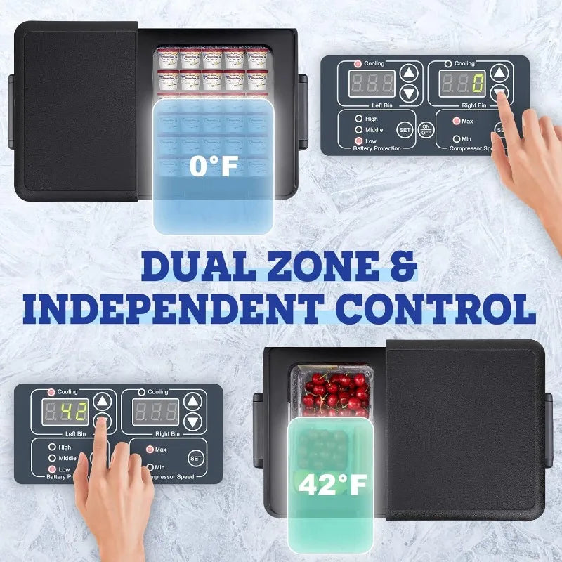 Dual Zone And Dual Temperature Control Electric Cooler: Setpower 12 Volt Refrigerator is equipped with a "true dual zone design" to avoid flavor transfer and mutual contamination of food between the two zones. This portable freezer can be independently controlled from 50°F to 0°F via the LCD panel.
