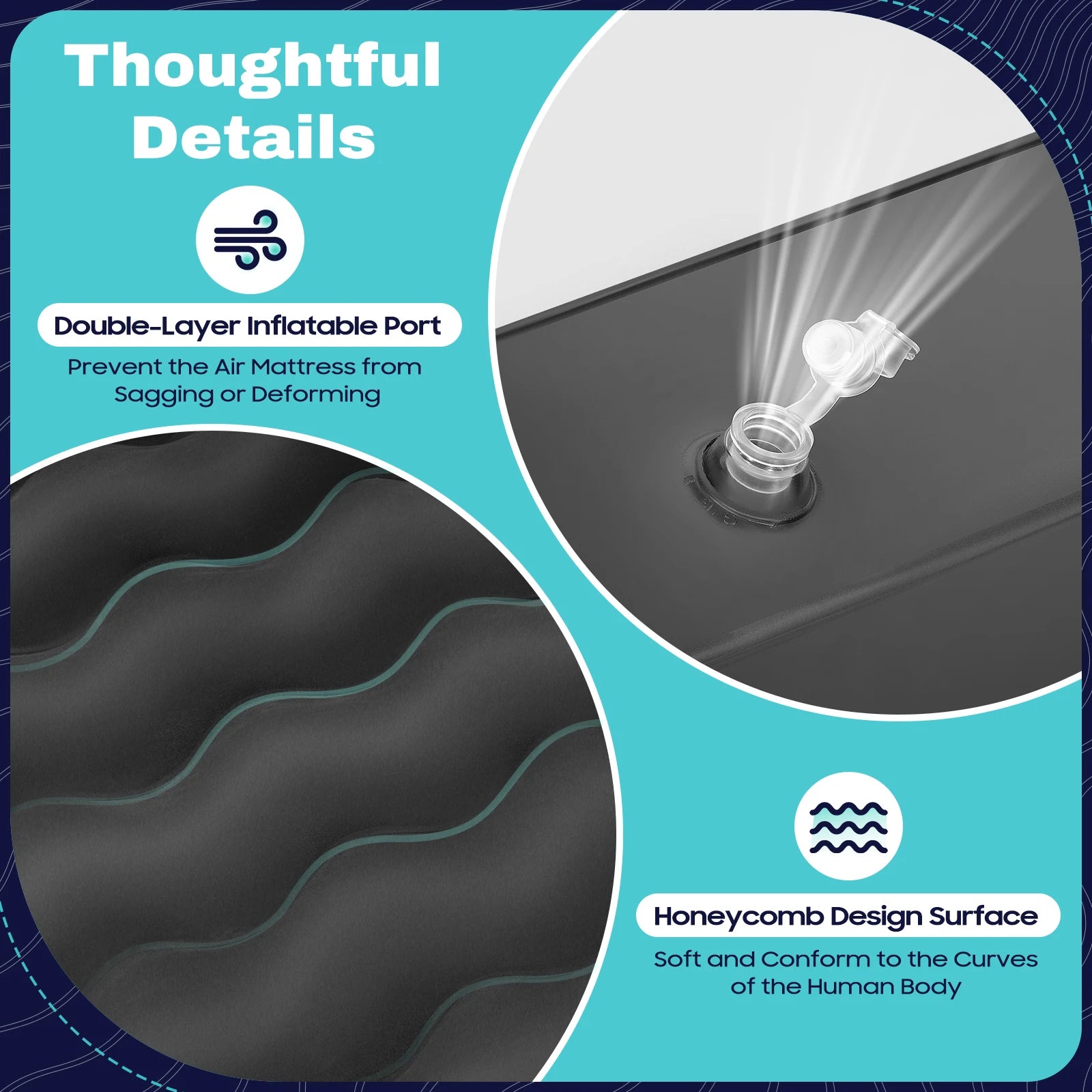 Flexible Use: The flexible double partition (width: 26.77in, 19.69in ) allows you to inflate it as needed, making it convenient for both one and two people, and better fitting the space in your car. In addition, two headrests are equipped to provide you with more comfort. Two head positions can stand up as a backrest.